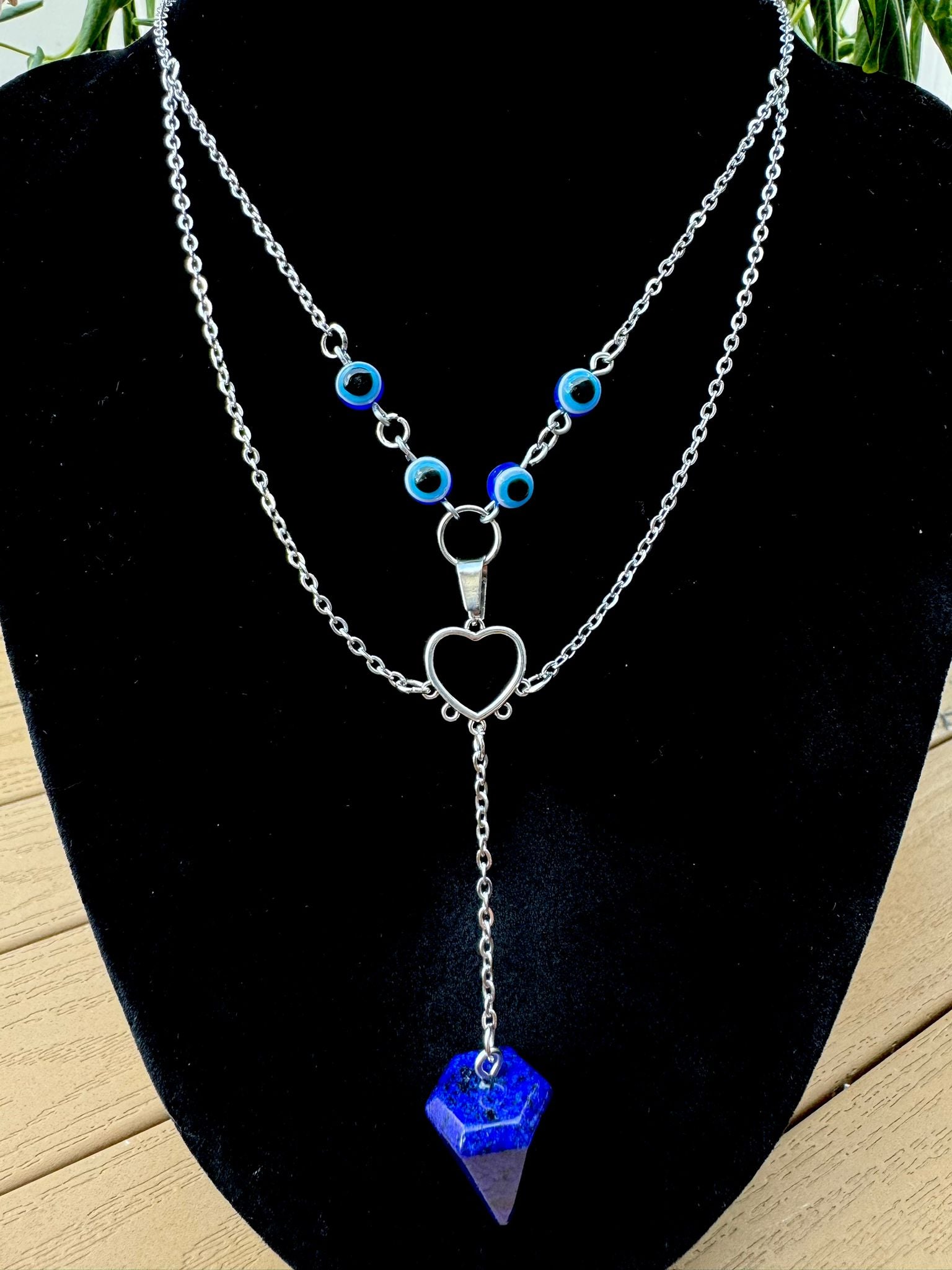 Collar de cuentas de mal de ojo en capas con dije de corazón + péndulo de lapislázuli