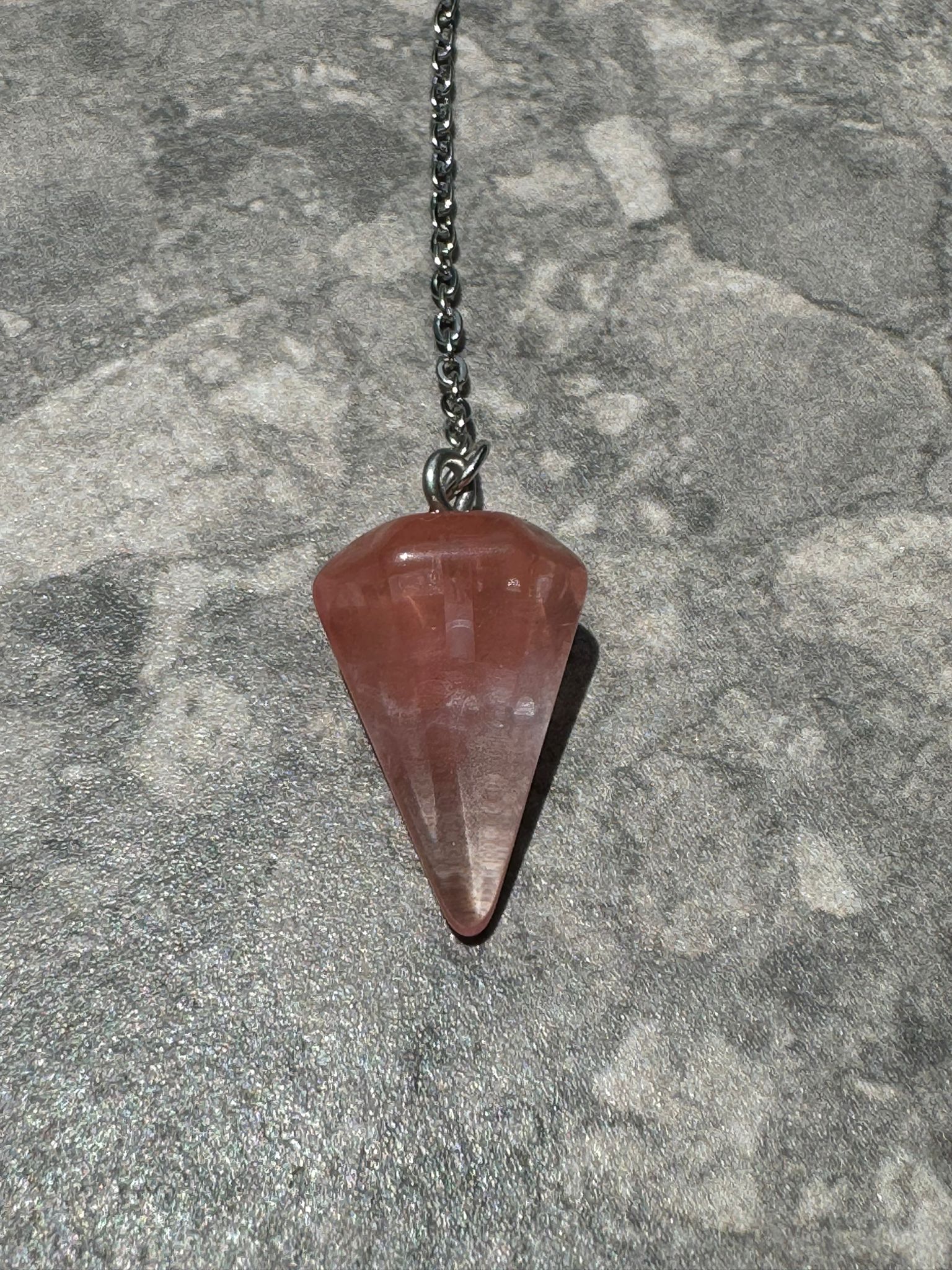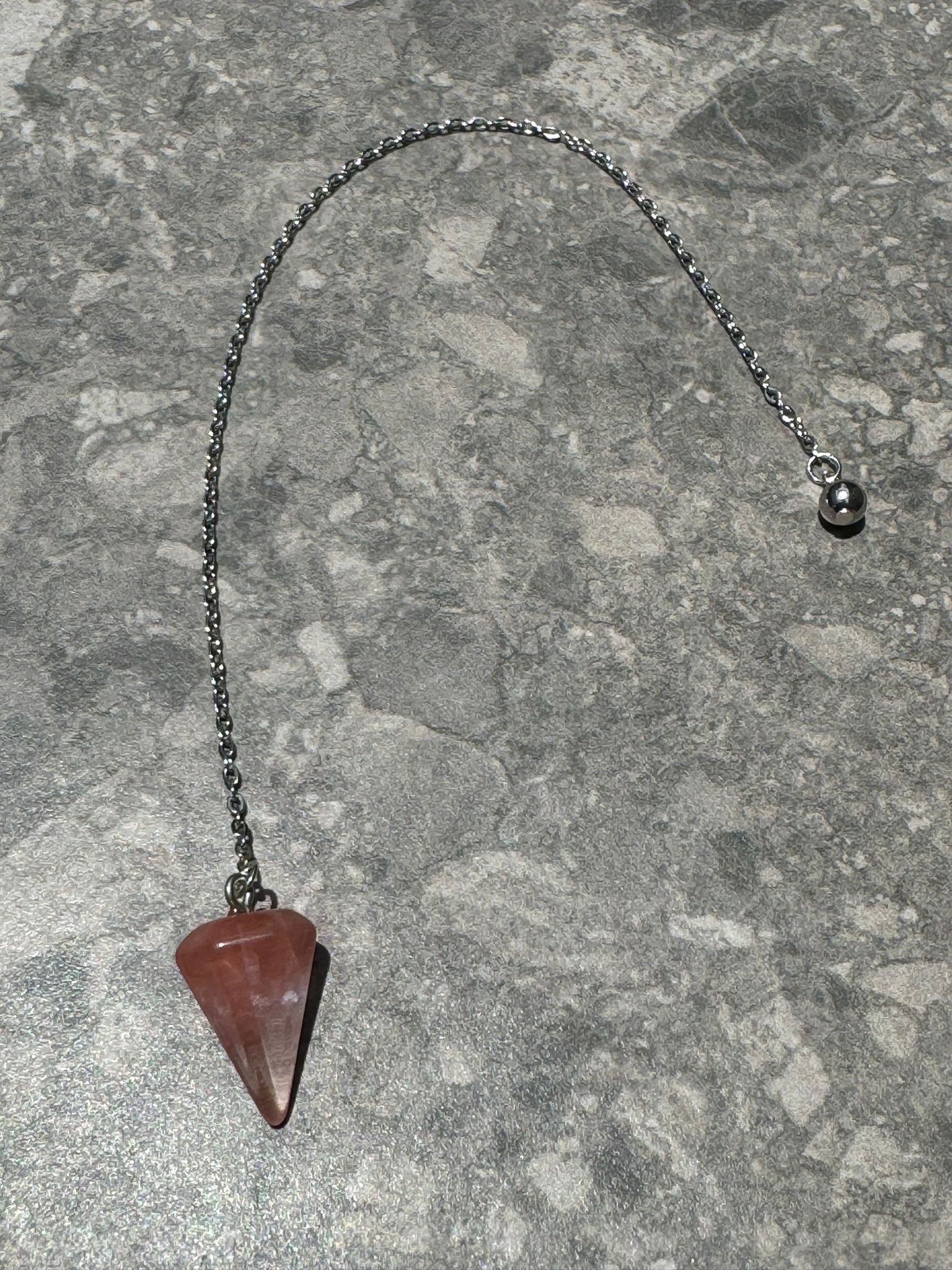 Péndulo de Cuarzo Cereza con un bonito tono cereza. Perfecto para radiestesia y adivinación, este péndulo está hecho de cuarzo cereza, un cristal conocido por sus propiedades calmantes y curativas, lo que lo hace ideal para la meditación y las prácticas espirituales.