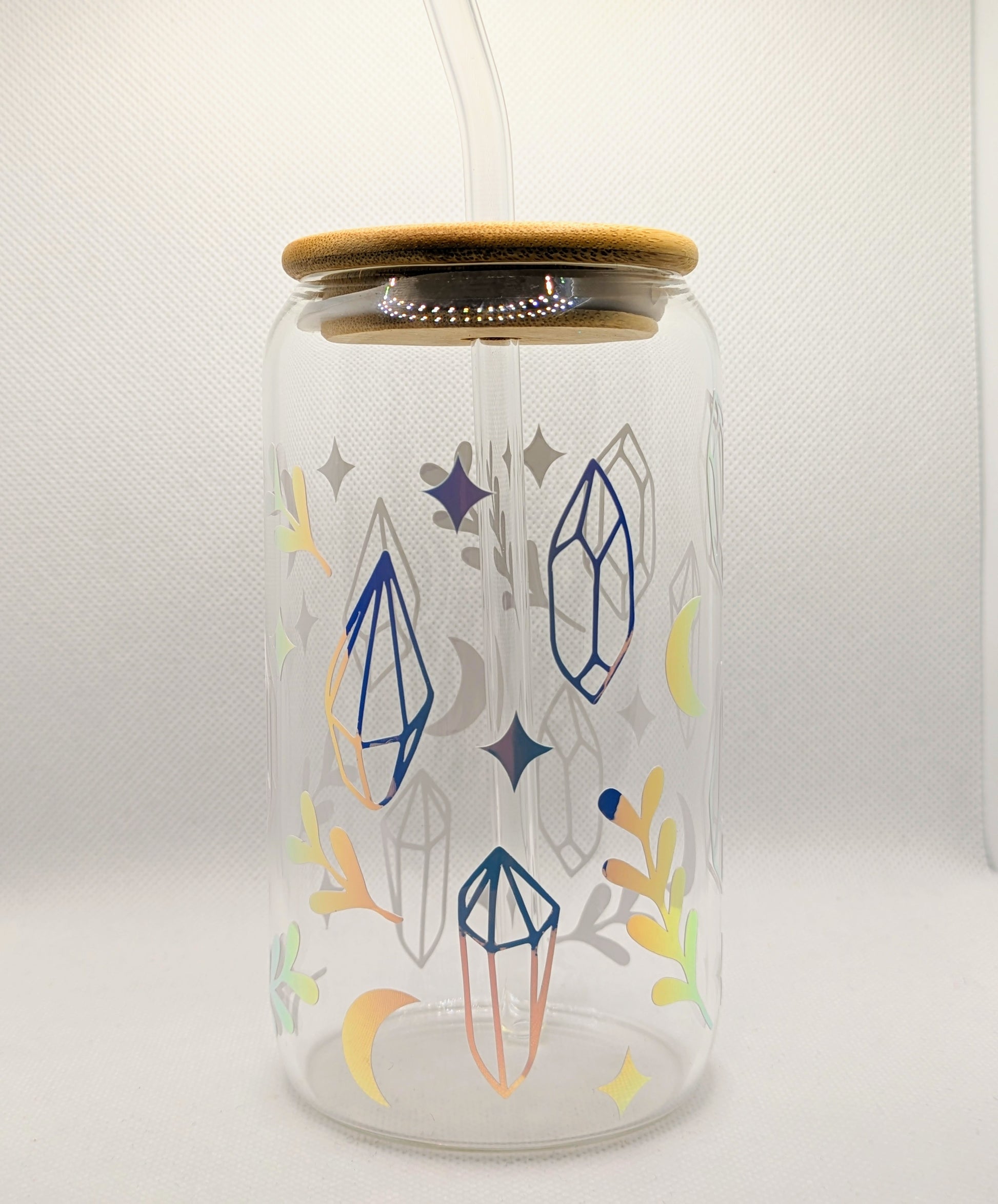 Vaso de cristal holográfico con tapa de bambú y pajita de cristal