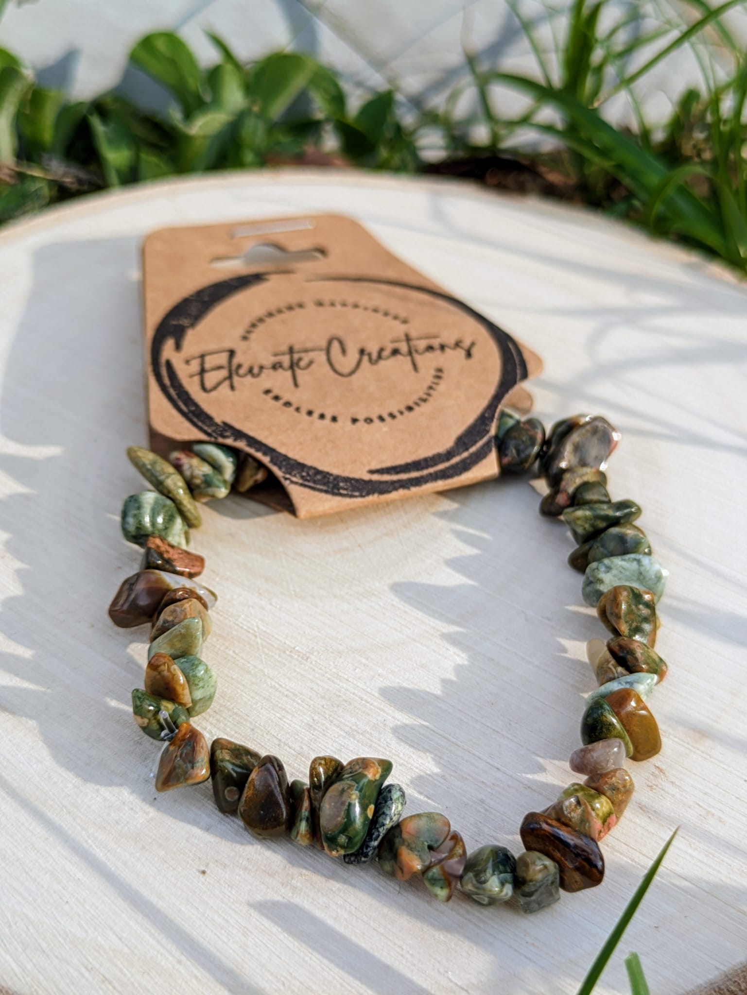 Descubra la belleza natural y la energía de nuestra pulsera con chips de riolita. Fabricada con auténticas astillas de piedra de riolita, esta pulsera de 7,5 pulgadas cuenta con una impresionante gama de colores terrosos y patrones únicos. Con sus propiedades de conexión a tierra y equilibrio, esta pulsera puede ayudarle a encontrar paz interior y estabilidad en cualquier situación.