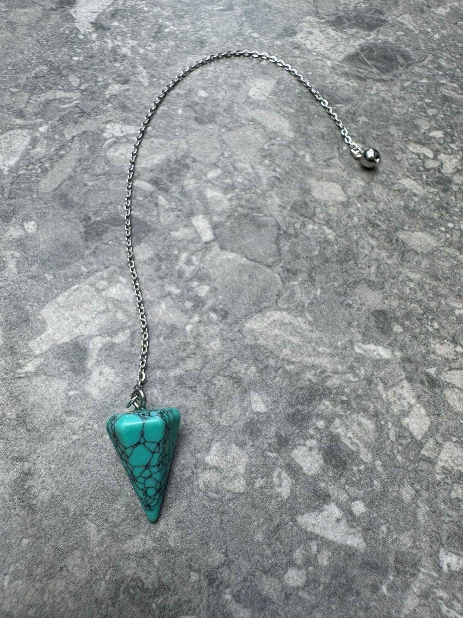 Este péndulo está elaborado con auténtica howlita turquesa, conocida por sus propiedades calmantes y calmantes. Su color y composición únicos lo convierten en una adición sorprendente a cualquier colección. Úselo para adivinación, equilibrio de chakras o como accesorio de moda. Experimente los beneficios de este poderoso cristal usted mismo.