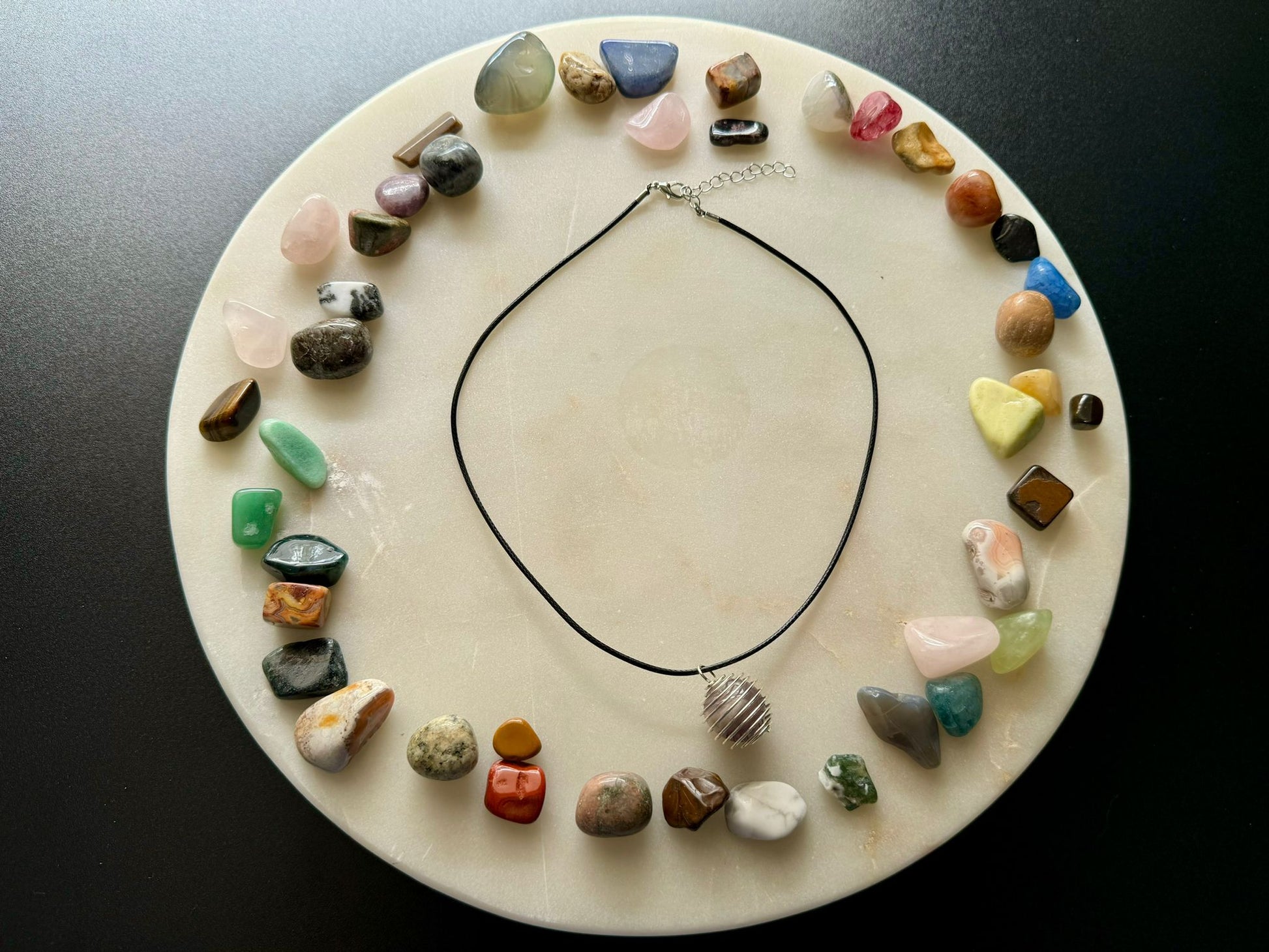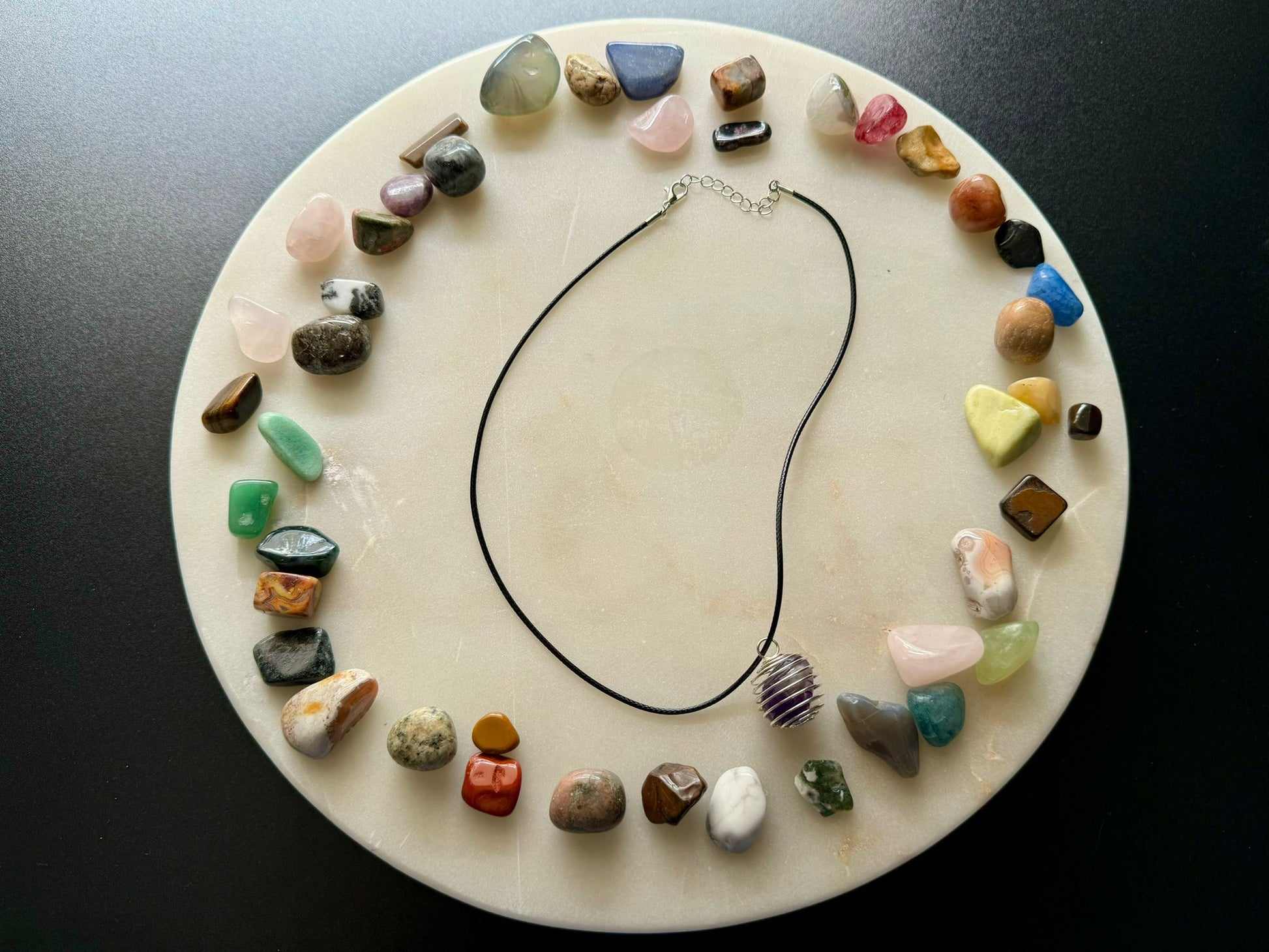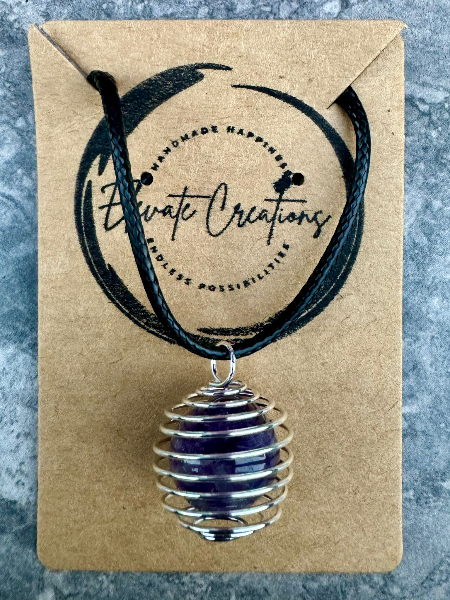 This stunning Amethyst necklace features a unique silver spiral bead cage design that showcases the natural beauty of the Amethyst stone. The silver cage allows for the stone to be seen from all angles, making it a versatile and eye-catching accessory. The healing properties of Amethyst are believed to promote calmness and balance. Elevate your outfit and mood with this elegant necklace.